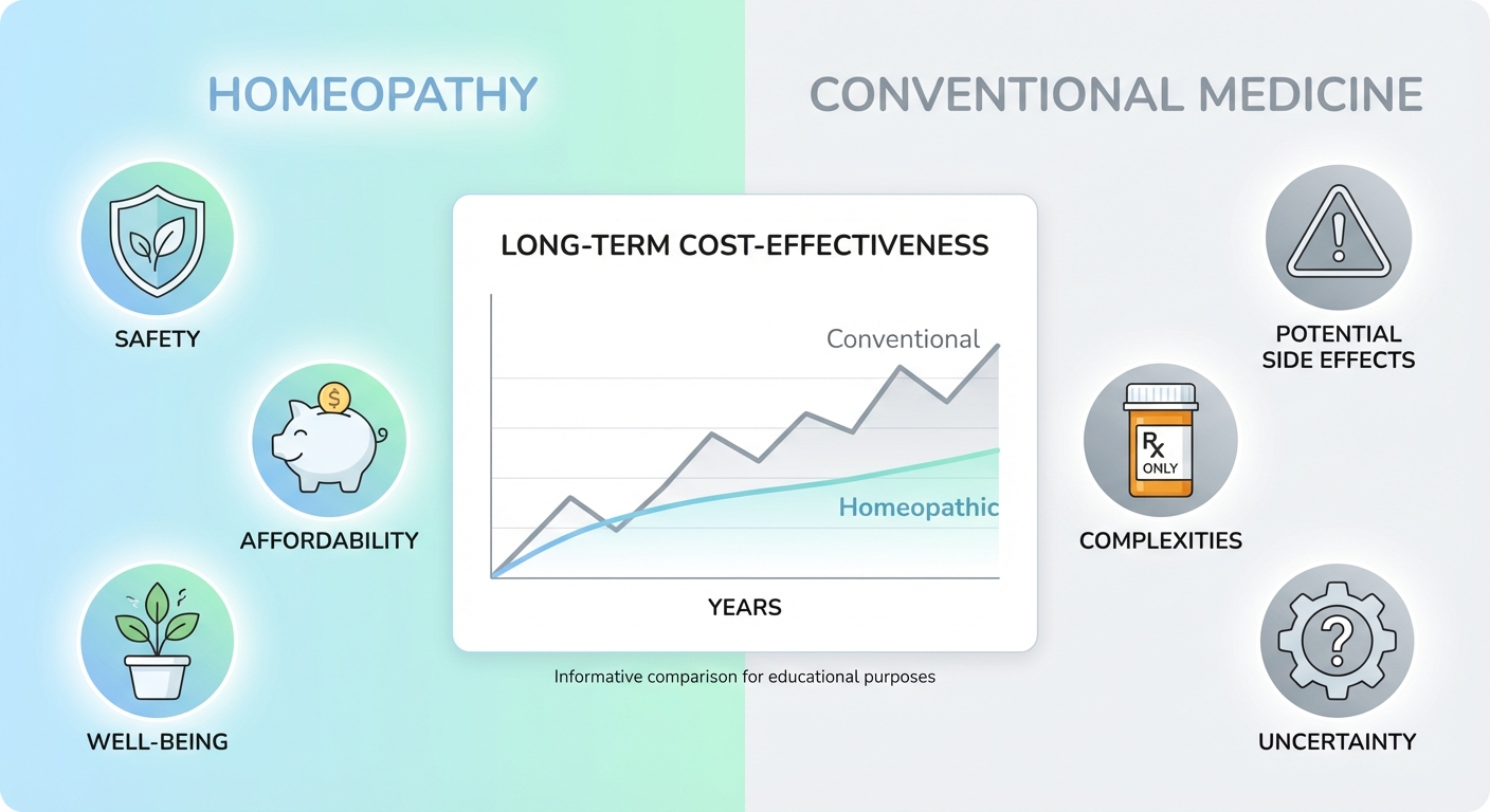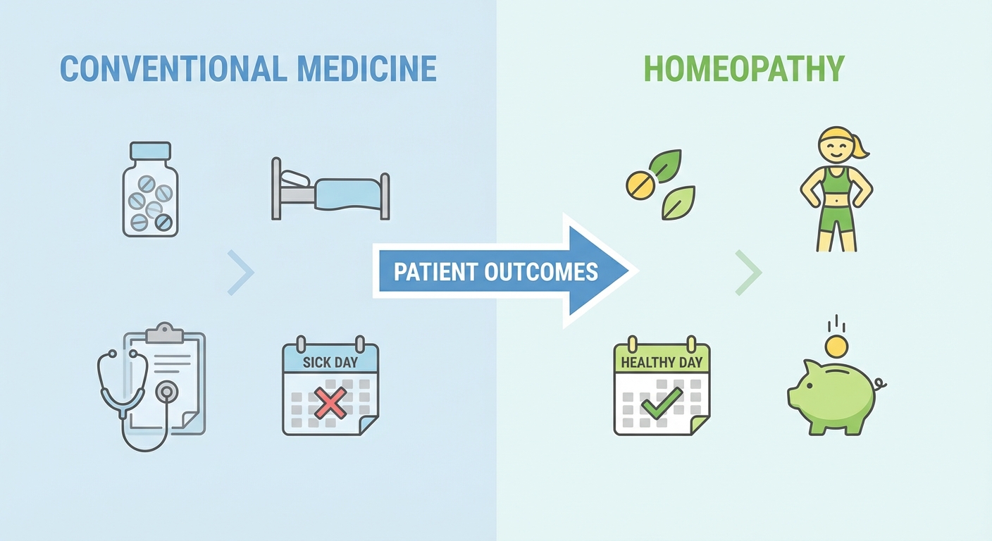 They show that patients who were treated with homeopathy used fewer medications, had better health, fewer days off sick, fewer visits to medical specialists, less time in the hospital than patients of conventional physicians. Moreover, there are no costs associated with complications due to adverse medication effects. In other words, homeopathy may offer significant cost savings to public health bodies, and to the economy more widely.