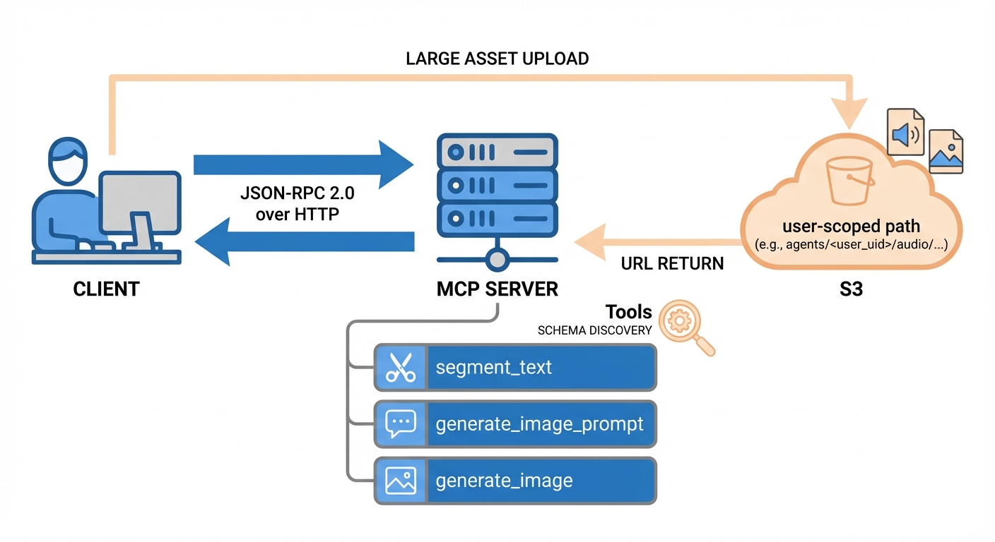 MCP (JSON-RPC 2.0 over HTTP) exposes segmenttext, generateimageprompt, and generateimage as tools with schema discovery. Large assets (audio, images) are automatically uploaded to S3 with user-scoped paths (agents/<user_uid>/audio/...) and returned as URLs to avoid message size limits.