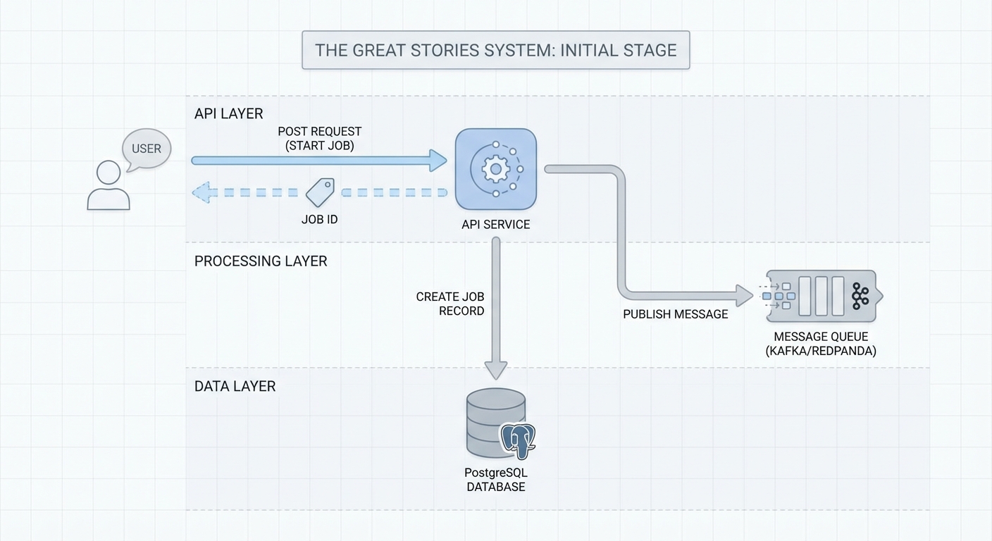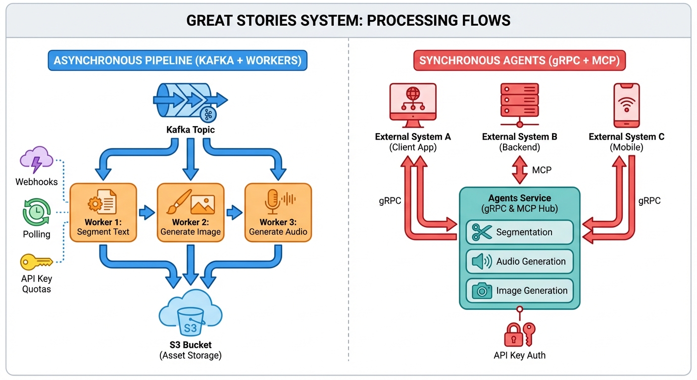 "The Great Stories" system has two main processing flows: Asynchronous pipeline (Kafka + workers): For full job processing with webhooks, polling, and API-key quotas. The worker processes jobs, segments text, generates images and audio, and stores assets in S3. Synchronous agents (gRPC + MCP): A separate agents service exposes segmentation, audio, and image generation over gRPC and MCP (Model Context Protocol) with API key auth. External systems can call these directly: gRPC provides all agents (segmentation, audio narration + TTS, image prompt + generation) with protobuf contracts.